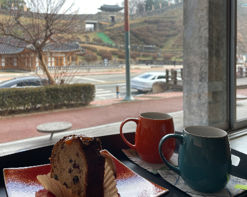 그리고 공산성 바로 앞에 공다방이라는 카페가 있어요. 공산성 카페 검색하면 많이 나오는 곳인데 탁 트인 통창으로 공산성을 바라보며 여유롭게 커피를 마실 수 있습니다. 커피도 원두 종류 선택할 수 있고 파운드 케이크도 맛있었어요. 공산성도 가볍게 산책하기 좋아서 추천합니다. 공주가 밤으로 유명하다보니 군밤축제, 알밤 박람회도 한다고 해요. 여행 날짜가 맞는 분들은 들려보셔도 재미있을 것 같아요.